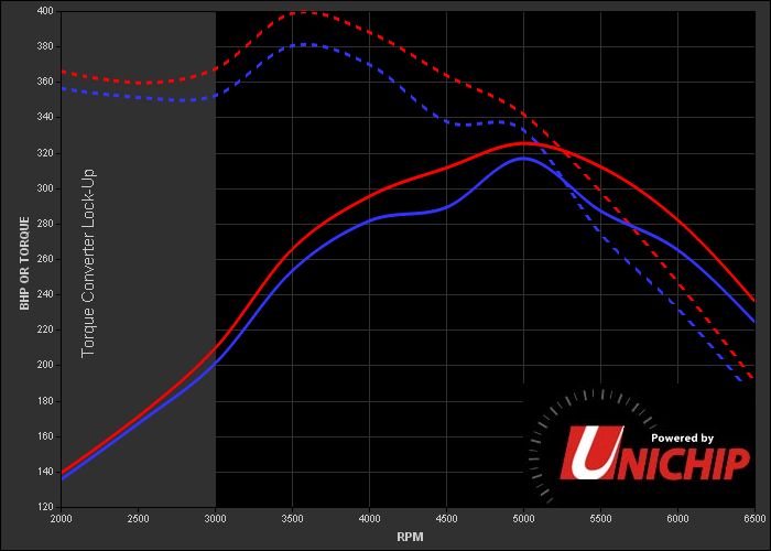 The solid blue line is BHP and the blue dotted line is torque.The sloid red line is BHP plus the unichip, the dotted red line is torque plus unichip.hope this helps let me know if anyone has used this