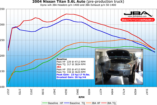 When Four Wheeler Magazine named the Nissan Titan "Pick-up Truck of the Year" it got the attention of every truck enthusiast. This new contender brings a high level of performance, style and many "firsts" to the highly competitive full-size truck market. JBA was ready to take the Titan to a new high with the first after-market smog legal headers and exhaust systems. How does an extra 23 hp and 17 ft.lbs. of torque sound? Want more? JBA's set-up will give you as much as 26 hp and 40+ ft.lbs of torque in the mid-range. That's enough power to get you to the top of the hill first with plenty of power in reserve. With the all that power on tap, you don't need to work the engine as hard - giving you some extra mileage.